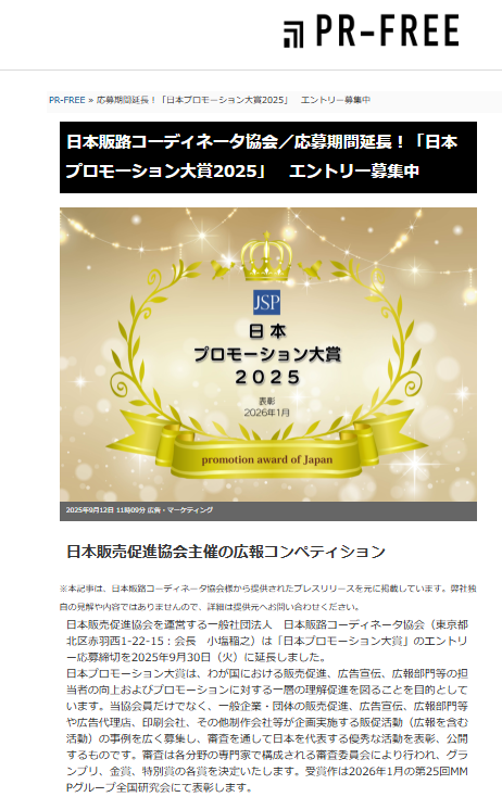 PR-FREEで「応募期間延長!『日本プロモーション大賞2025』エントリー募集中」が掲載されました。