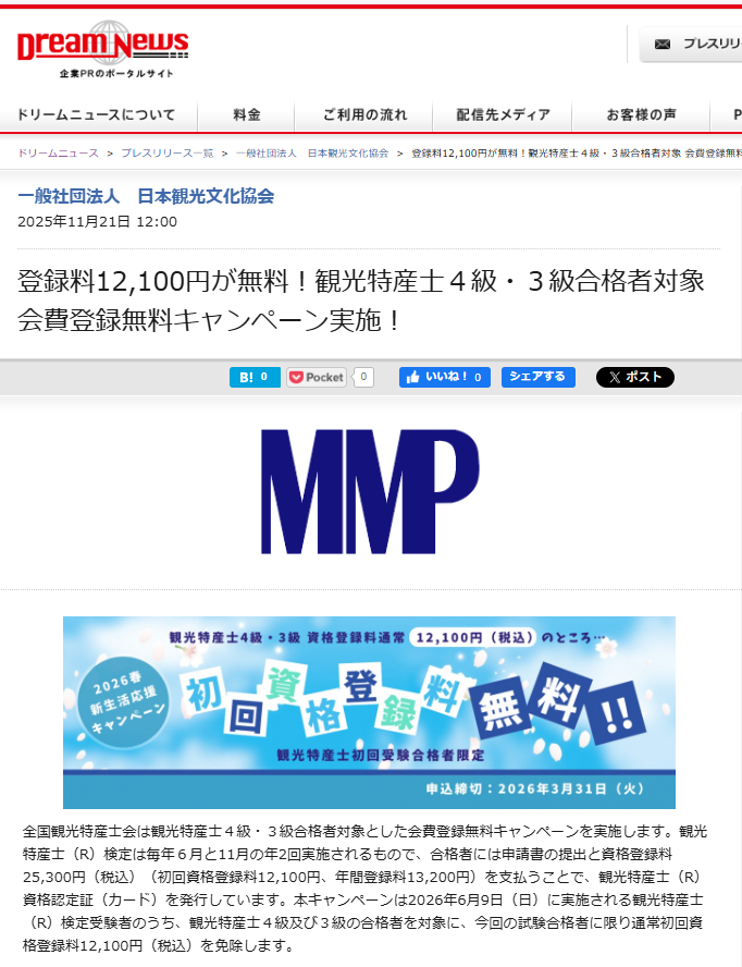 Dream Newsに「登録料12,100円が無料!観光特産士4級・3級合格者対象 会費登録無料キャンペーン実施!」が掲載されました。