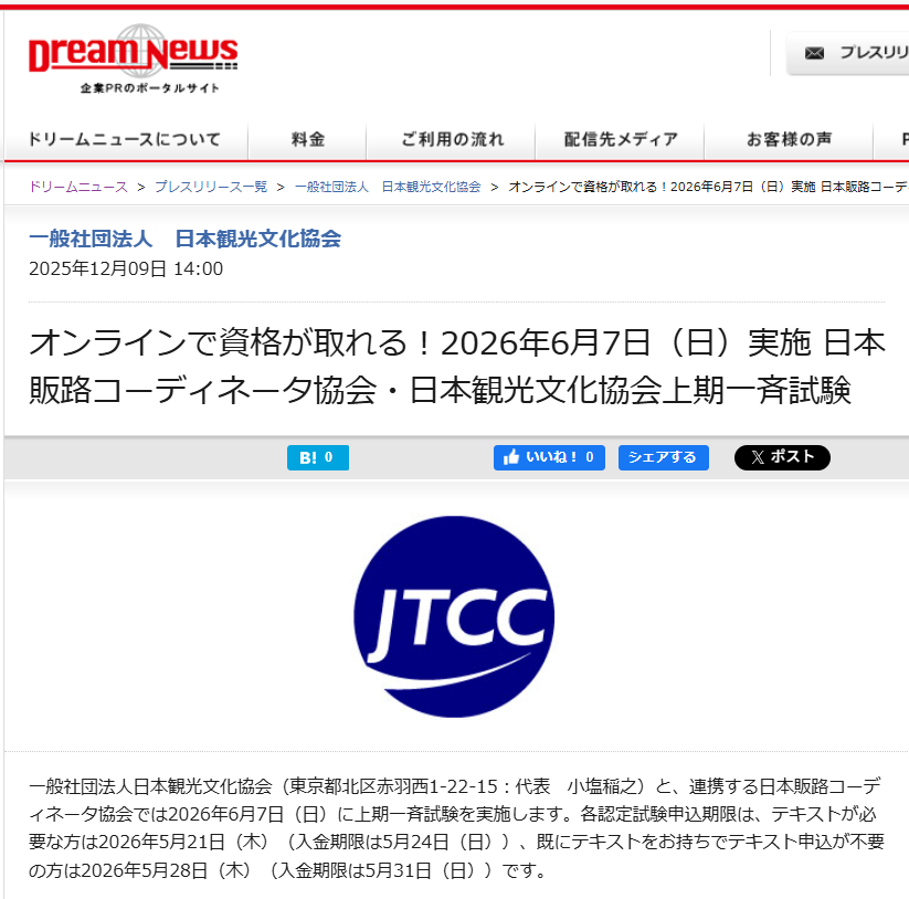 Dream Newsに「オンラインで資格が取れる!2026年6月7日(日)実施 日本販路コーディネータ協会・日本観光文化協会上期一斉試験」が掲載されました。