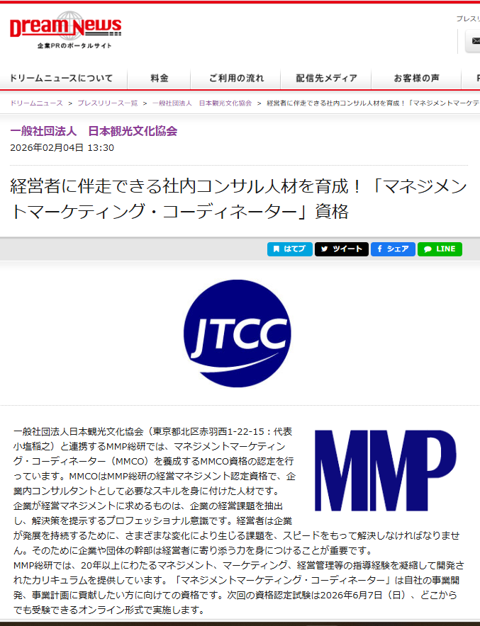 Dream Newsに「経営者に伴走できる社内コンサル人材を育成!『マネジメントマーケティング・コーディネーター』資格」が掲載されました。