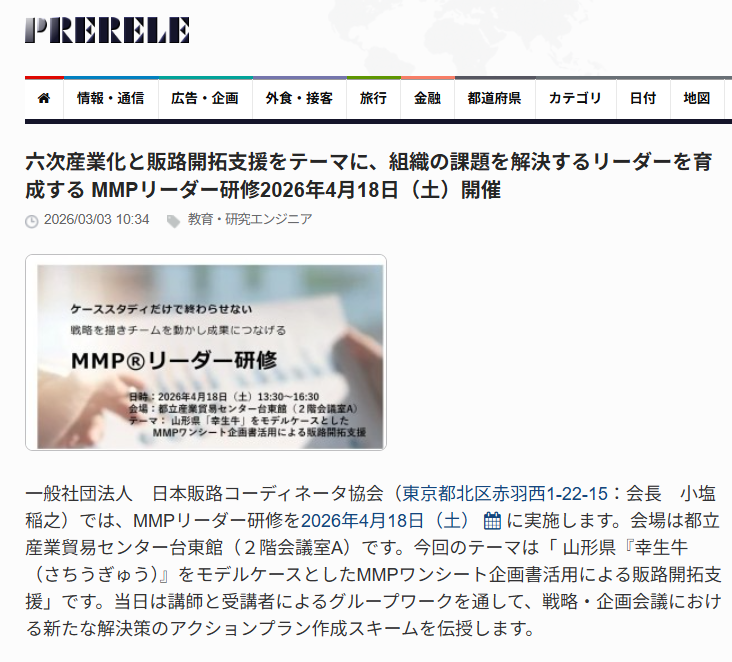 ぷれりりに「六次産業化と販路開拓支援をテーマに、組織の課題を解決するリーダーを育成するMMPリーダー研修 2026年4月18日(土)開催」が掲載されました。