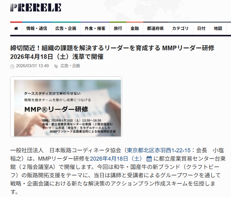 ぷれりりに「締切間近!組織の課題を解決するリーダーを育成する MMPリーダー研修2026年4月18日(土)浅草で開催」が掲載されました。