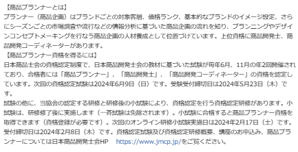 プランナー(商品企画)はブランドごとの対象客層、価格ランク、基本的なブランドのイメージ設定、さらにシーズンごとの市場調査や流行などの情報分析に基づいた商品企画の流れを知り、プランニングやデザインコンセプトメーキングを行なう商品企画の人材養成として位置づけています。上位資格に商品開発士、商品開発コーディネーターがあります。 【商品プランナー資格を得るには】 日本商品士会の資格認定制度で、日本商品開発士会の教材に基づいた試験が毎年6月、11月の年2回開催されており、合格者には「商品プランナー」、「商品開発士」、「商品開発コーディネーター」の資格を認定しています。次回の資格認定試験は2024年6月9日(日)です。受験受付締切日は2024年5月23日(木)です。 試験の他に、当協会の認定する研修と研修後の小試験により、資格認定を行う資格認定研修があります。小試験は、研修修了後に実施します(一斉試験は免除されます)。小試験に合格すると商品プランナー資格を取得できます(資格登録が必要です)。次回のオンライン研修小試験実施日は2024年2月17日(土)です。受付締切日は2024年2月8日(木)です。 資格認定試験及び資格認定研修概要、講座のお申込み、商品プランナーについては日本商品開発士会HP https://www.jmcp.jp/をご覧ください。